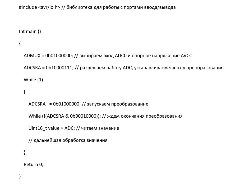 В данном примере происходит выбор входного канала (ADC0) и опорного напряжения (AVCC), а затем с помощью регистров ADCSRA и ADC читается текущее значение на этом канале. Также в цикле можно добавить обработку полученного значения, например, вывод на дисплей или передачу по интерфейсу связи.